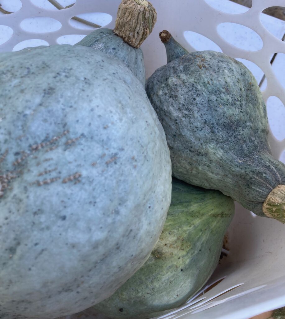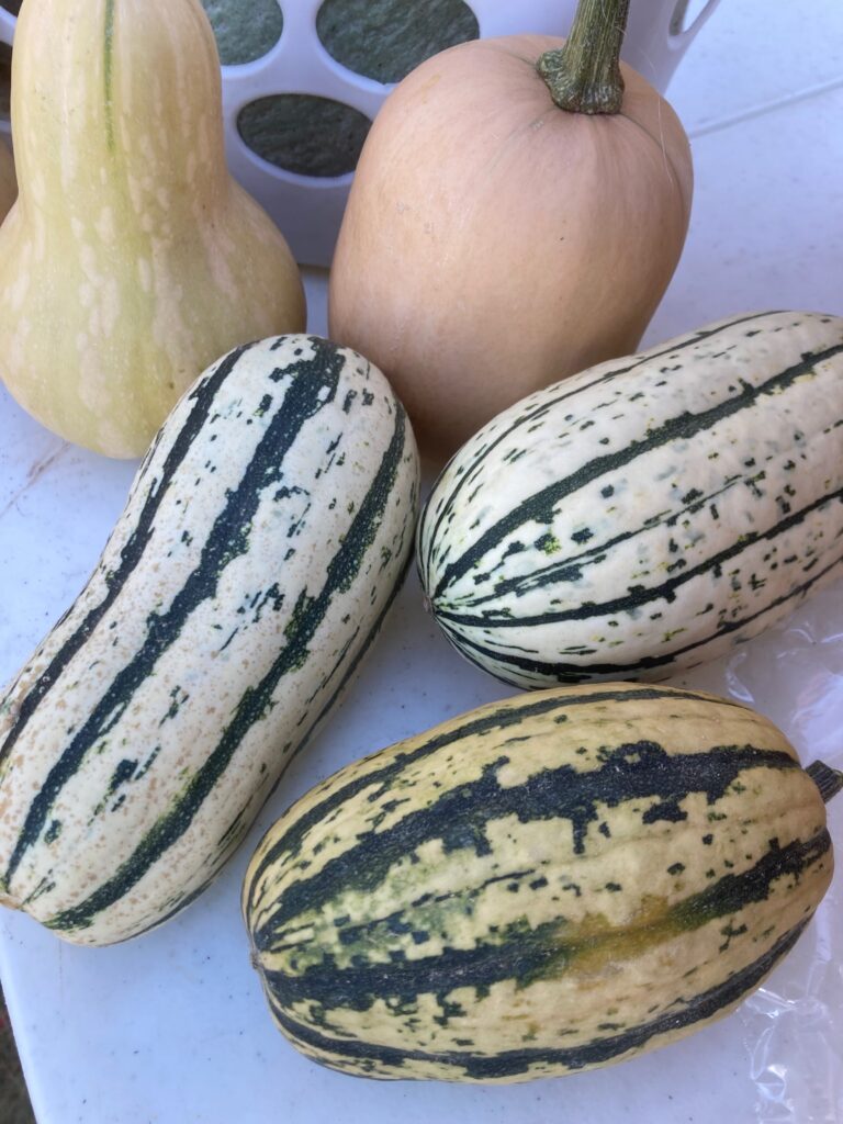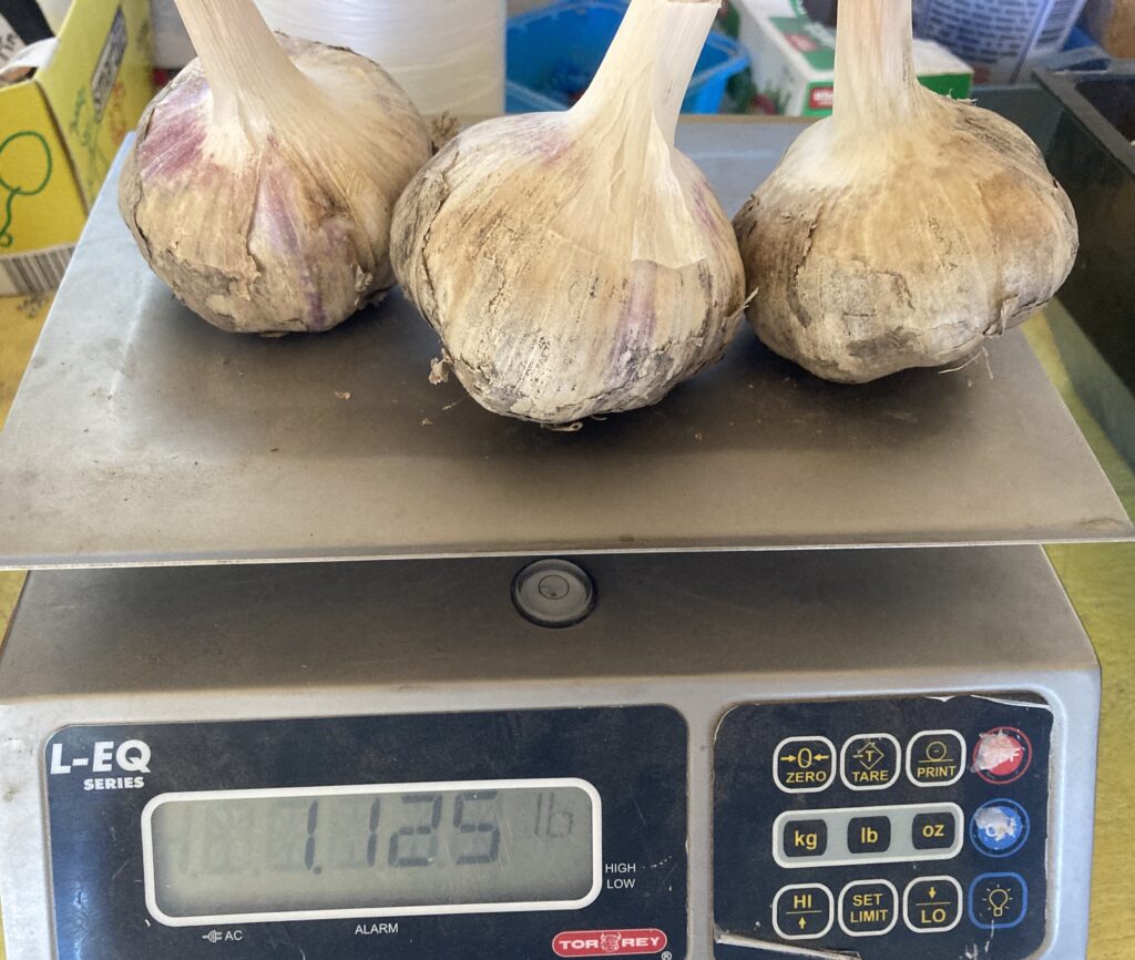 Elephant Garlic–technically in leek family, but divides and tastes like a mild garlic. We love it!